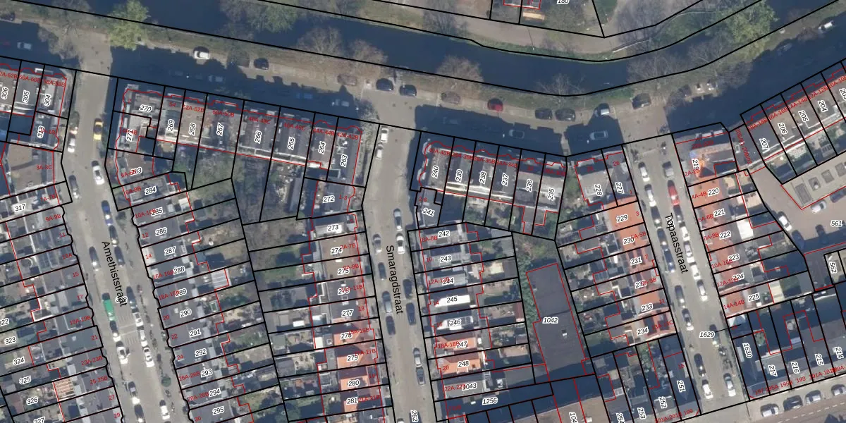 Het perceel waarop Smaragdstraat 4 staat heeft een oppervlakte van 43 m². Dit is een klein perceel. De perceeloppervlakte wordt geregistreerd door het Kadaster. Gedetailleerde informatie over de maten van dit perceel kunt u vinden in het rapport Kadastrale kaart met maatvoering van Smaragdstraat 4.