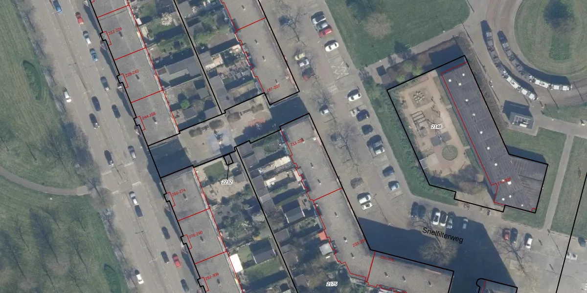Snelfilterweg 223 is gelegen op kadastraal perceel KLG00E2175. Deze kadastrale aanduiding is uniek en wordt gebruikt door het Kadaster om eigendomsrechten en andere zakelijke rechten vast te leggen. Het perceel maakt onderdeel uit van de kadastrale gemeente Kralingen.