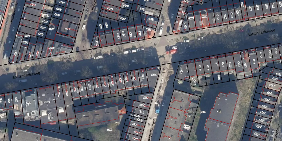 Soetendaalseweg 46-A is gelegen op kadastraal perceel RTD09Y2930. Deze kadastrale aanduiding is uniek en wordt gebruikt door het Kadaster om eigendomsrechten en andere zakelijke rechten vast te leggen. Het perceel maakt onderdeel uit van de kadastrale gemeente Rotterdam.