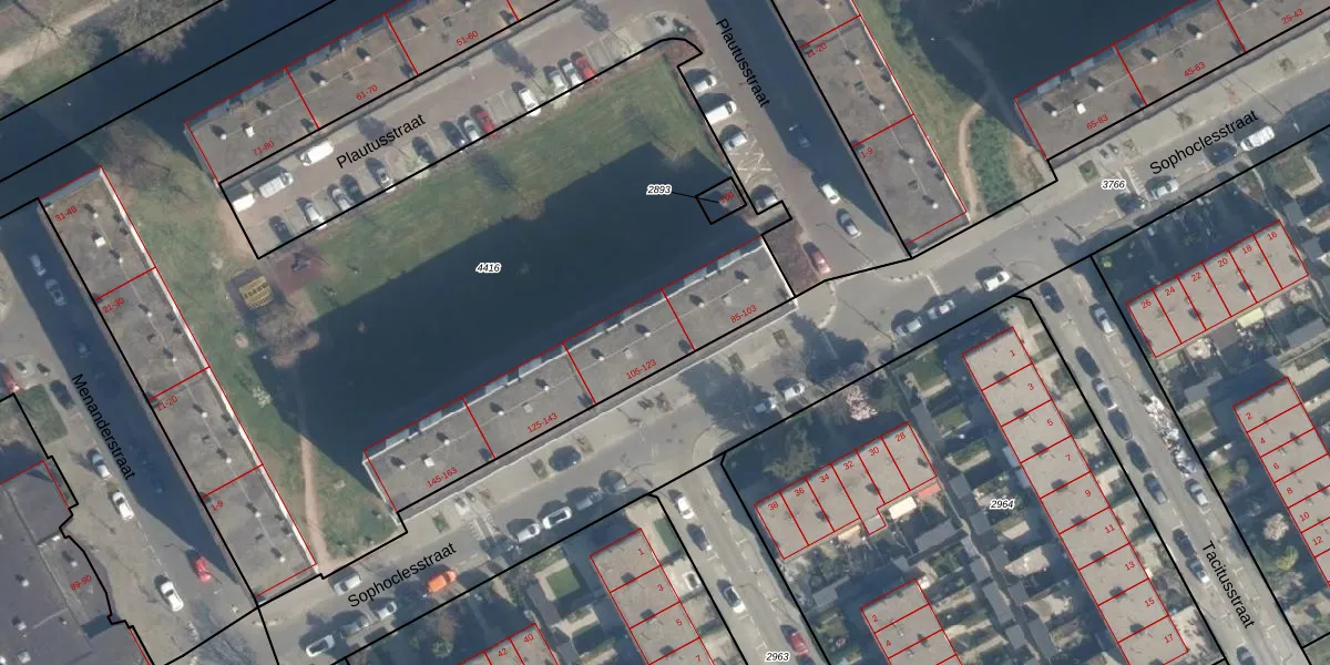 Het perceel waarop Sophoclesstraat 105 staat heeft een oppervlakte van 1,3 ha. Dit is een zeer groot perceel. De perceeloppervlakte wordt geregistreerd door het Kadaster. Gedetailleerde informatie over de maten van dit perceel kunt u vinden in het rapport Kadastrale kaart met maatvoering van Sophoclesstraat 105.