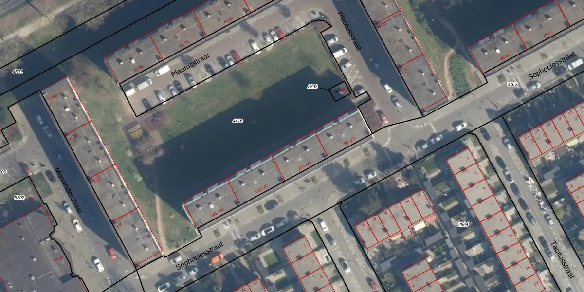 Het perceel waarop Sophoclesstraat 117 staat heeft een oppervlakte van 1,3 ha. Dit is een zeer groot perceel. De perceeloppervlakte wordt geregistreerd door het Kadaster. Gedetailleerde informatie over de maten van dit perceel kunt u vinden in het rapport Kadastrale kaart met maatvoering van Sophoclesstraat 117.