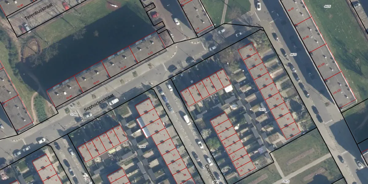 Het perceel waarop Sophoclesstraat 14 staat heeft een oppervlakte van 3677 m². Dit is een zeer groot perceel. De perceeloppervlakte wordt geregistreerd door het Kadaster. Gedetailleerde informatie over de maten van dit perceel kunt u vinden in het rapport Kadastrale kaart met maatvoering van Sophoclesstraat 14.