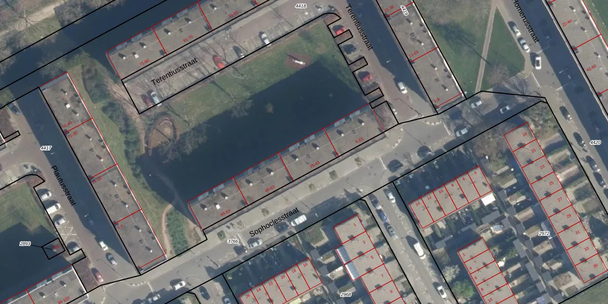 Het perceel waarop Sophoclesstraat 35 staat heeft een oppervlakte van 1,3 ha. Dit is een zeer groot perceel. De perceeloppervlakte wordt geregistreerd door het Kadaster. Gedetailleerde informatie over de maten van dit perceel kunt u vinden in het rapport Kadastrale kaart met maatvoering van Sophoclesstraat 35.