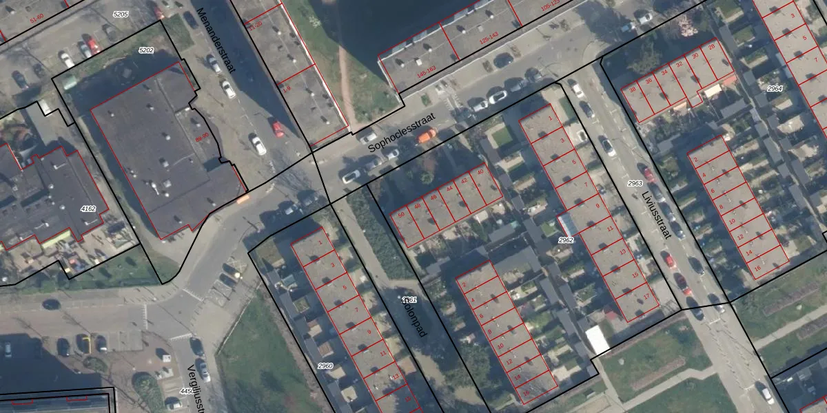 Het perceel waarop Sophoclesstraat 48 staat heeft een oppervlakte van 3428 m². Dit is een zeer groot perceel. De perceeloppervlakte wordt geregistreerd door het Kadaster. Gedetailleerde informatie over de maten van dit perceel kunt u vinden in het rapport Kadastrale kaart met maatvoering van Sophoclesstraat 48.
