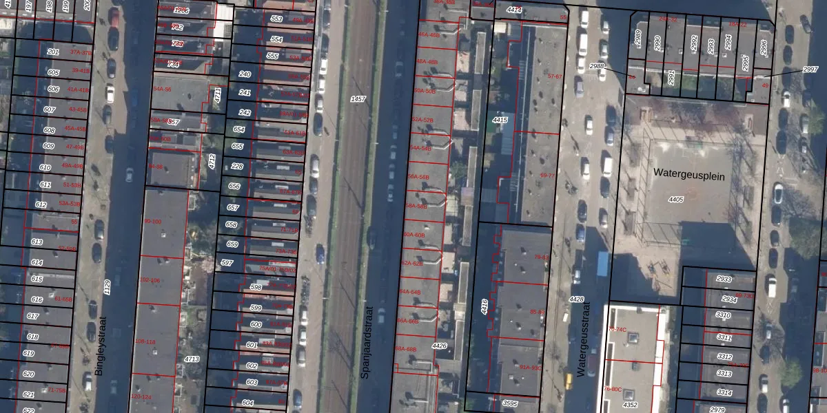 Het perceel waarop Spanjaardstraat 58-B staat heeft een oppervlakte van 3681 m². Dit is een zeer groot perceel. De perceeloppervlakte wordt geregistreerd door het Kadaster. Gedetailleerde informatie over de maten van dit perceel kunt u vinden in het rapport Kadastrale kaart met maatvoering van Spanjaardstraat 58-B.