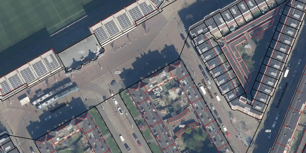 Het perceel waarop Spartastraat 90 staat heeft een oppervlakte van 3745 m². Dit is een zeer groot perceel. De perceeloppervlakte wordt geregistreerd door het Kadaster. Gedetailleerde informatie over de maten van dit perceel kunt u vinden in het rapport Kadastrale kaart met maatvoering van Spartastraat 90.