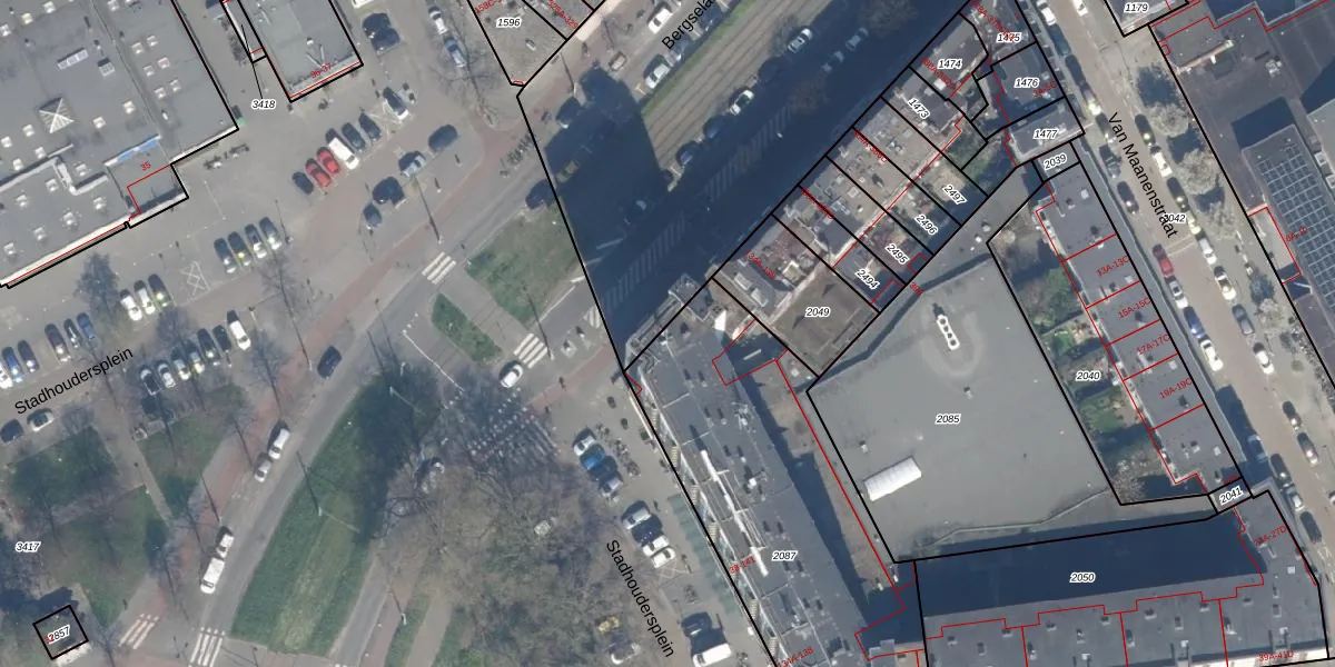 Stadhoudersplein 112 is gelegen op kadastraal perceel RTD10AB2087. Deze kadastrale aanduiding is uniek en wordt gebruikt door het Kadaster om eigendomsrechten en andere zakelijke rechten vast te leggen. Het perceel maakt onderdeel uit van de kadastrale gemeente Rotterdam.