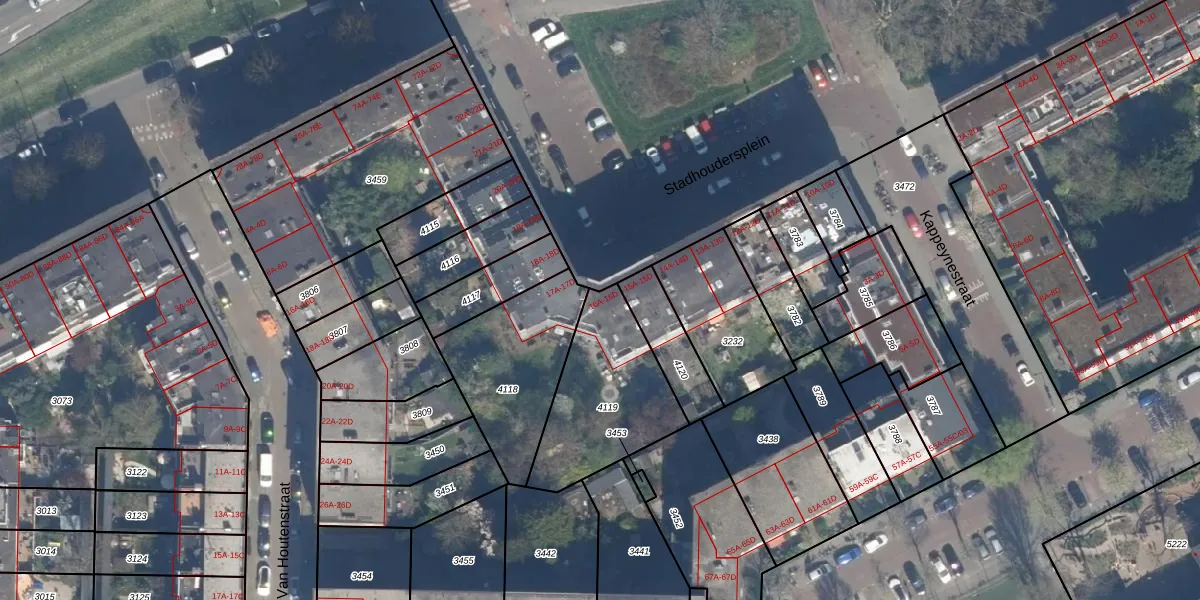 Stadhoudersplein 16-D is gelegen op kadastraal perceel RTD10Z4119. Deze kadastrale aanduiding is uniek en wordt gebruikt door het Kadaster om eigendomsrechten en andere zakelijke rechten vast te leggen. Het perceel maakt onderdeel uit van de kadastrale gemeente Rotterdam.