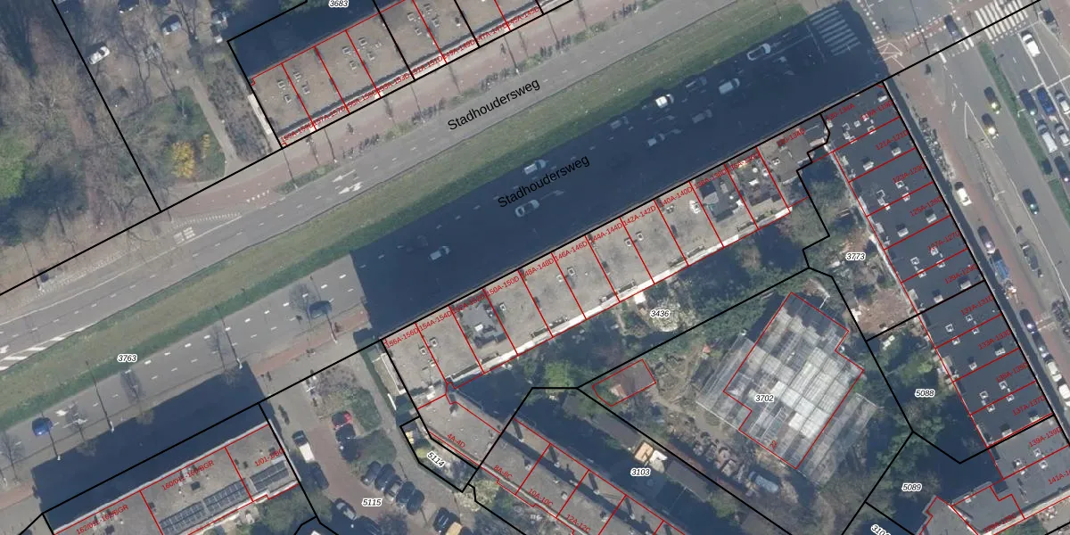 Stadhoudersweg 148-B is gelegen op kadastraal perceel RTD10Z3436. Deze kadastrale aanduiding is uniek en wordt gebruikt door het Kadaster om eigendomsrechten en andere zakelijke rechten vast te leggen. Het perceel maakt onderdeel uit van de kadastrale gemeente Rotterdam.