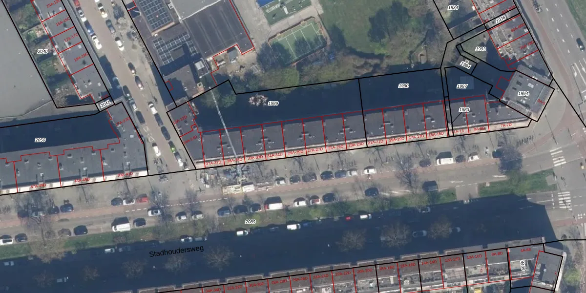 Stadhoudersweg 29-A is gelegen op kadastraal perceel RTD10AB1989. Deze kadastrale aanduiding is uniek en wordt gebruikt door het Kadaster om eigendomsrechten en andere zakelijke rechten vast te leggen. Het perceel maakt onderdeel uit van de kadastrale gemeente Rotterdam.