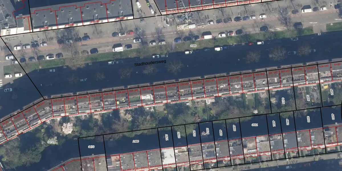 Stadhoudersweg 34-A is gelegen op kadastraal perceel RTD10Z3474. Deze kadastrale aanduiding is uniek en wordt gebruikt door het Kadaster om eigendomsrechten en andere zakelijke rechten vast te leggen. Het perceel maakt onderdeel uit van de kadastrale gemeente Rotterdam.