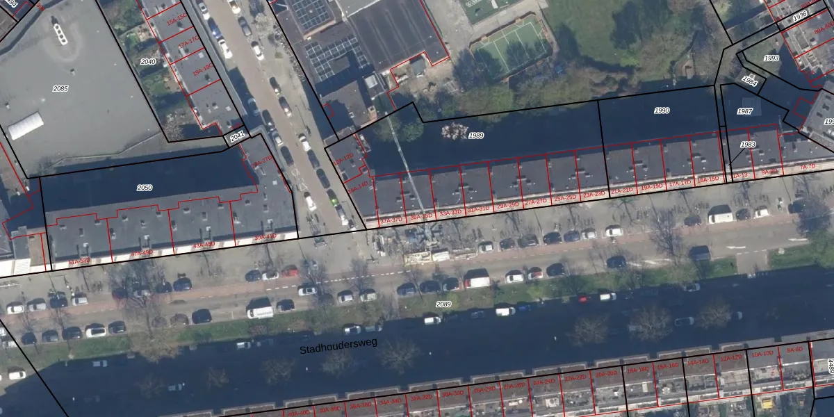 Stadhoudersweg 35-A is gelegen op kadastraal perceel RTD10AB1989. Deze kadastrale aanduiding is uniek en wordt gebruikt door het Kadaster om eigendomsrechten en andere zakelijke rechten vast te leggen. Het perceel maakt onderdeel uit van de kadastrale gemeente Rotterdam.