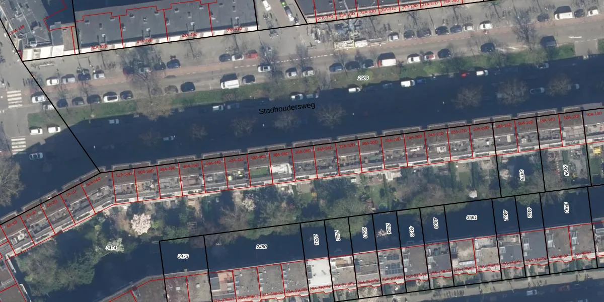 Stadhoudersweg 36-B is gelegen op kadastraal perceel RTD10Z3474. Deze kadastrale aanduiding is uniek en wordt gebruikt door het Kadaster om eigendomsrechten en andere zakelijke rechten vast te leggen. Het perceel maakt onderdeel uit van de kadastrale gemeente Rotterdam.