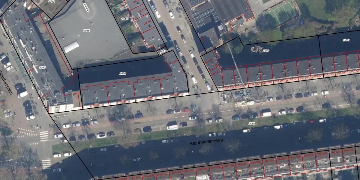 Stadhoudersweg 39-D is gelegen op kadastraal perceel RTD10AB2050. Deze kadastrale aanduiding is uniek en wordt gebruikt door het Kadaster om eigendomsrechten en andere zakelijke rechten vast te leggen. Het perceel maakt onderdeel uit van de kadastrale gemeente Rotterdam.