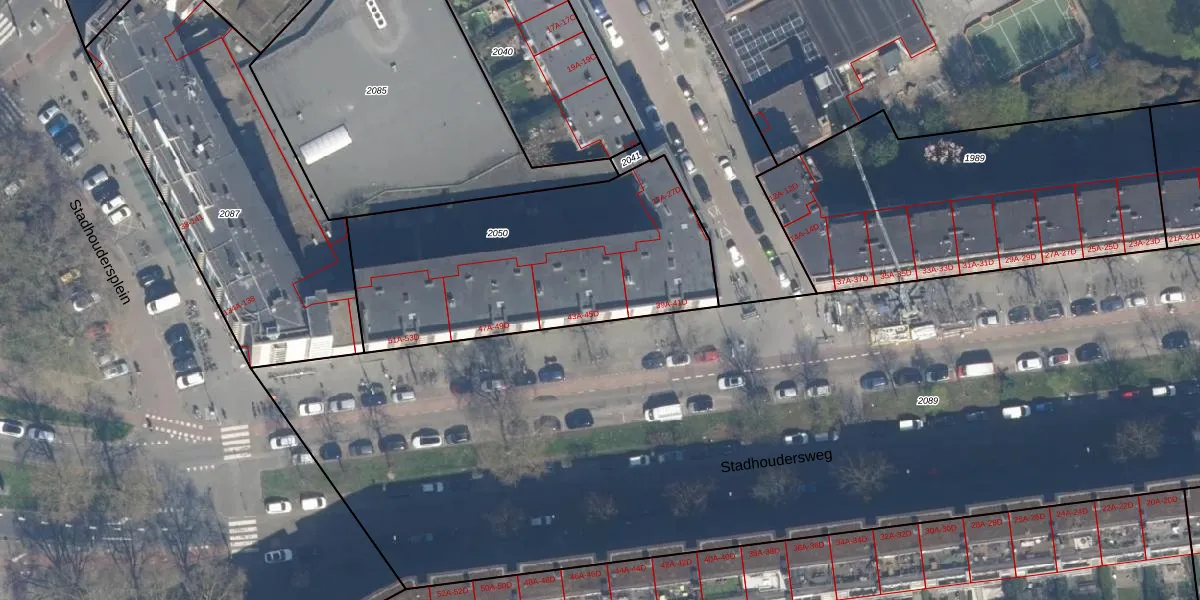 Stadhoudersweg 43-C is gelegen op kadastraal perceel RTD10AB2050. Deze kadastrale aanduiding is uniek en wordt gebruikt door het Kadaster om eigendomsrechten en andere zakelijke rechten vast te leggen. Het perceel maakt onderdeel uit van de kadastrale gemeente Rotterdam.