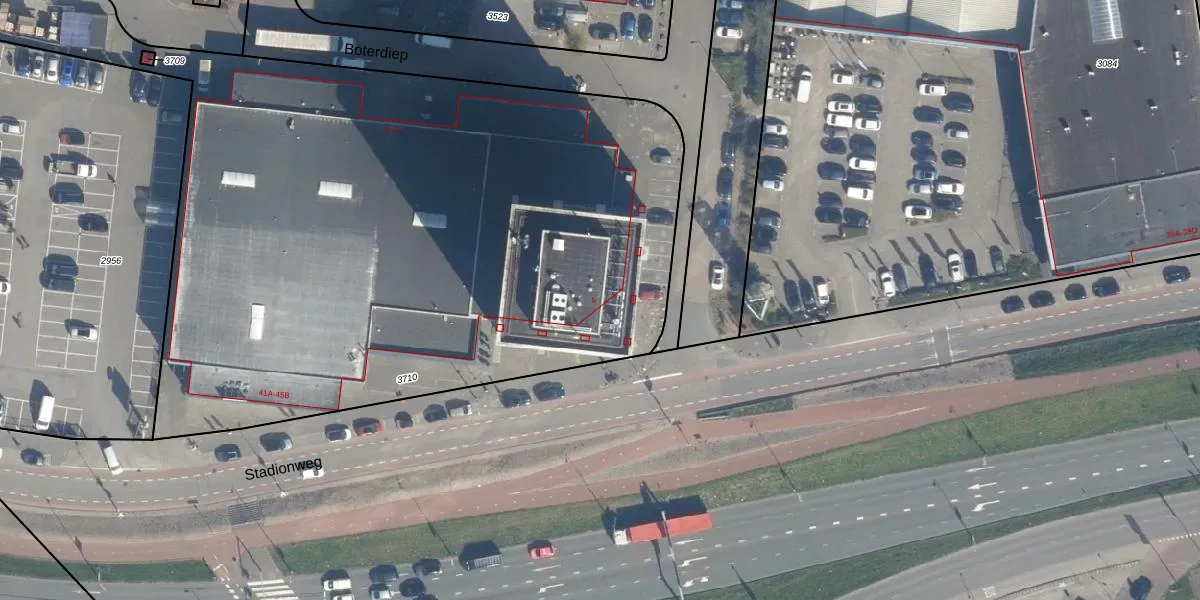 Het perceel waarop Stadionweg 41-E staat heeft een oppervlakte van 4918 m². Dit is een zeer groot perceel. De perceeloppervlakte wordt geregistreerd door het Kadaster. Gedetailleerde informatie over de maten van dit perceel kunt u vinden in het rapport Kadastrale kaart met maatvoering van Stadionweg 41-E.