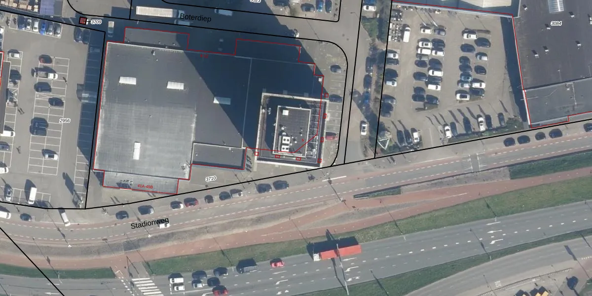 Het perceel waarop Stadionweg 43-E staat heeft een oppervlakte van 4918 m². Dit is een zeer groot perceel. De perceeloppervlakte wordt geregistreerd door het Kadaster. Gedetailleerde informatie over de maten van dit perceel kunt u vinden in het rapport Kadastrale kaart met maatvoering van Stadionweg 43-E.