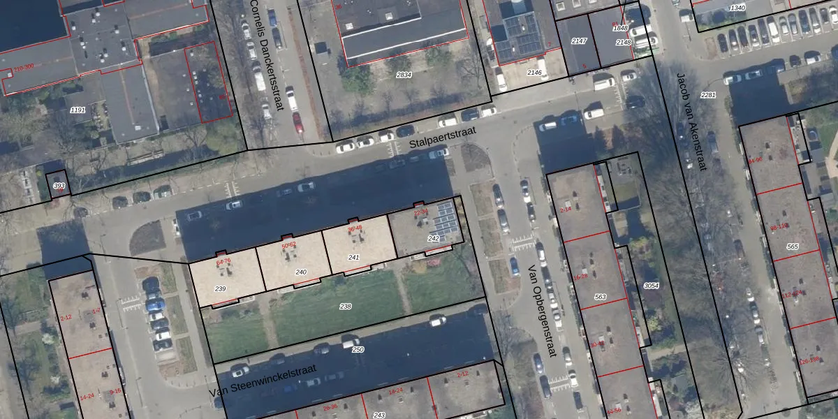 Stalpaertstraat 30 is gelegen op kadastraal perceel KLG00K242. Deze kadastrale aanduiding is uniek en wordt gebruikt door het Kadaster om eigendomsrechten en andere zakelijke rechten vast te leggen. Het perceel maakt onderdeel uit van de kadastrale gemeente Kralingen.