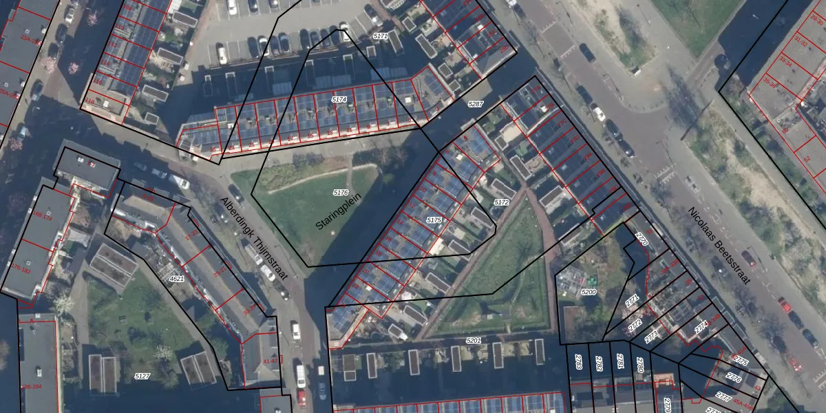 Het perceel waarop Staringplein 12 staat heeft een oppervlakte van 445 m². Dit is een groot perceel. De perceeloppervlakte wordt geregistreerd door het Kadaster. Gedetailleerde informatie over de maten van dit perceel kunt u vinden in het rapport Kadastrale kaart met maatvoering van Staringplein 12.