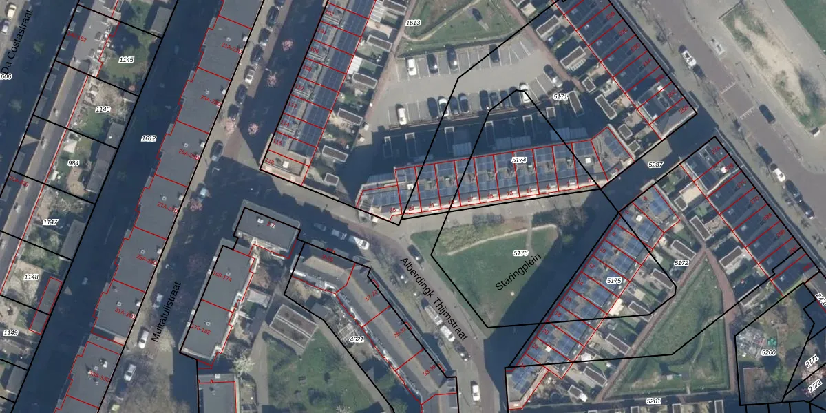 Het perceel waarop Staringplein 23 staat heeft een oppervlakte van 1681 m². Dit is een zeer groot perceel. De perceeloppervlakte wordt geregistreerd door het Kadaster. Gedetailleerde informatie over de maten van dit perceel kunt u vinden in het rapport Kadastrale kaart met maatvoering van Staringplein 23.