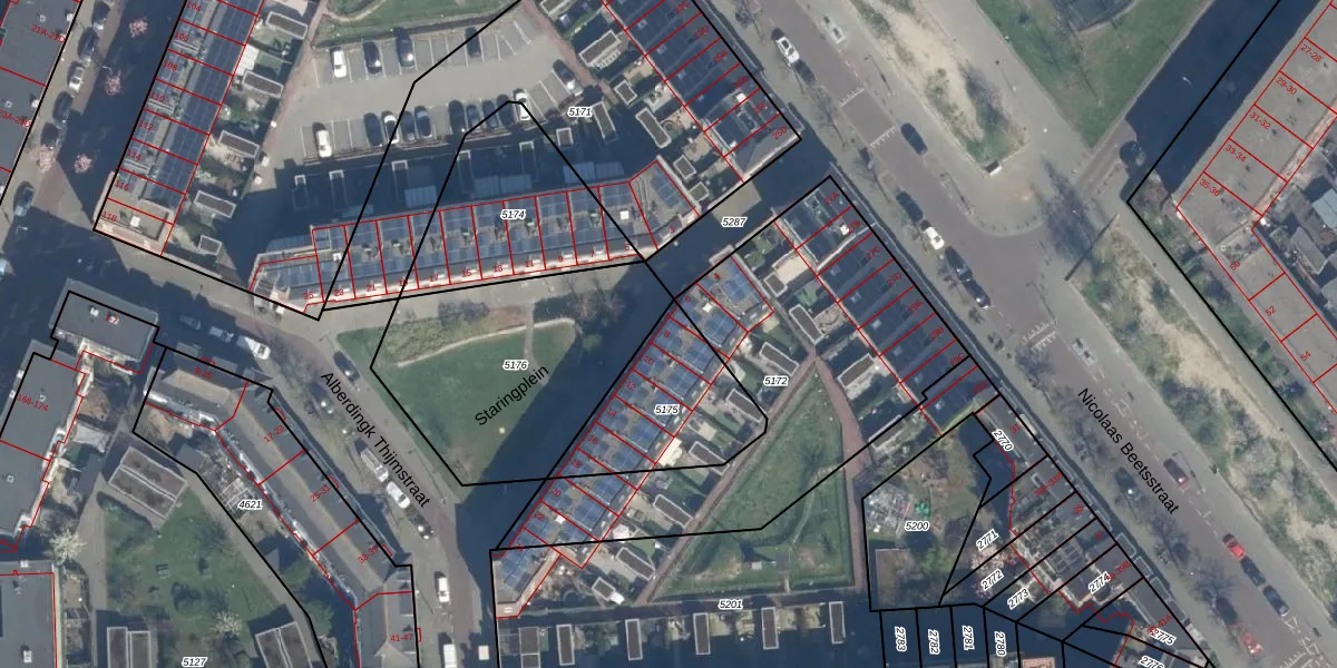 Het perceel waarop Staringplein 8 staat heeft een oppervlakte van 445 m². Dit is een groot perceel. De perceeloppervlakte wordt geregistreerd door het Kadaster. Gedetailleerde informatie over de maten van dit perceel kunt u vinden in het rapport Kadastrale kaart met maatvoering van Staringplein 8.