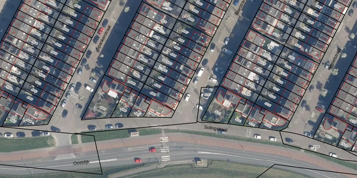 Het perceel waarop Starstraat 8 staat heeft een oppervlakte van 106 m². Dit is een middelgroot perceel. De perceeloppervlakte wordt geregistreerd door het Kadaster. Gedetailleerde informatie over de maten van dit perceel kunt u vinden in het rapport Kadastrale kaart met maatvoering van Starstraat 8.