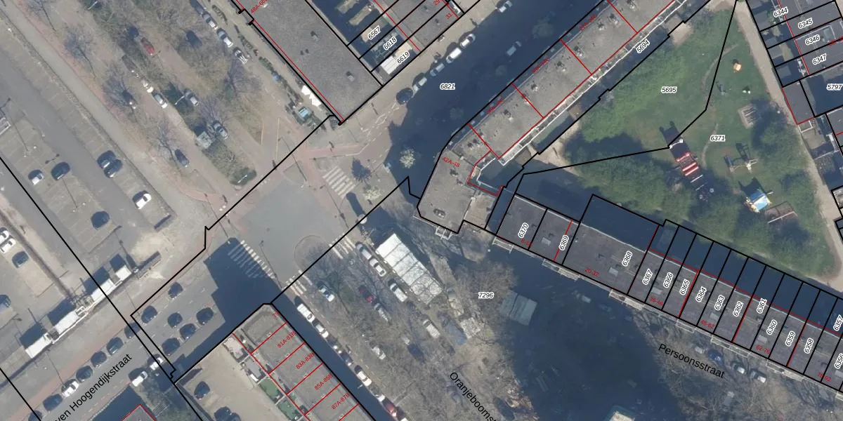 Het perceel waarop het adres ligt is RTD05-Q-5694. De afkorting 'RTD05' staat voor kadastrale gemeente Rotterdam. De oppervlakte van het perceel is 1954 m². Dat is groter dan gemiddeld in Rotterdam, waar de gemiddelde perceeloppervlakte op 1401,79 m² ligt. De grootste perceeloppervlakte in de kadastrale gemeente is 36,8 ha. De kleinste oppervlakte bedraagt 0 m². Op het perceel zijn 58 adressen aanwezig. In de Basisregistratie Kadaster (BRK) werden de grenzen van het perceel geregistreerd op 29-01-2003.