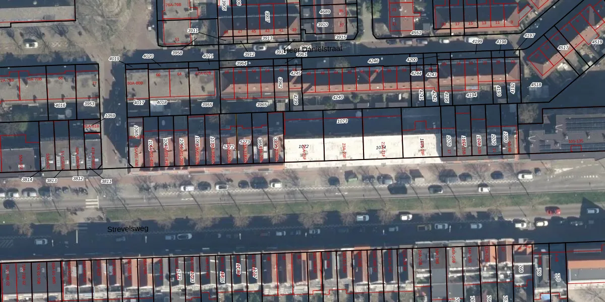 Strevelsweg 25-B is gelegen op kadastraal perceel CLS00F1072. Deze kadastrale aanduiding is uniek en wordt gebruikt door het Kadaster om eigendomsrechten en andere zakelijke rechten vast te leggen. Het perceel maakt onderdeel uit van de kadastrale gemeente Charlois.