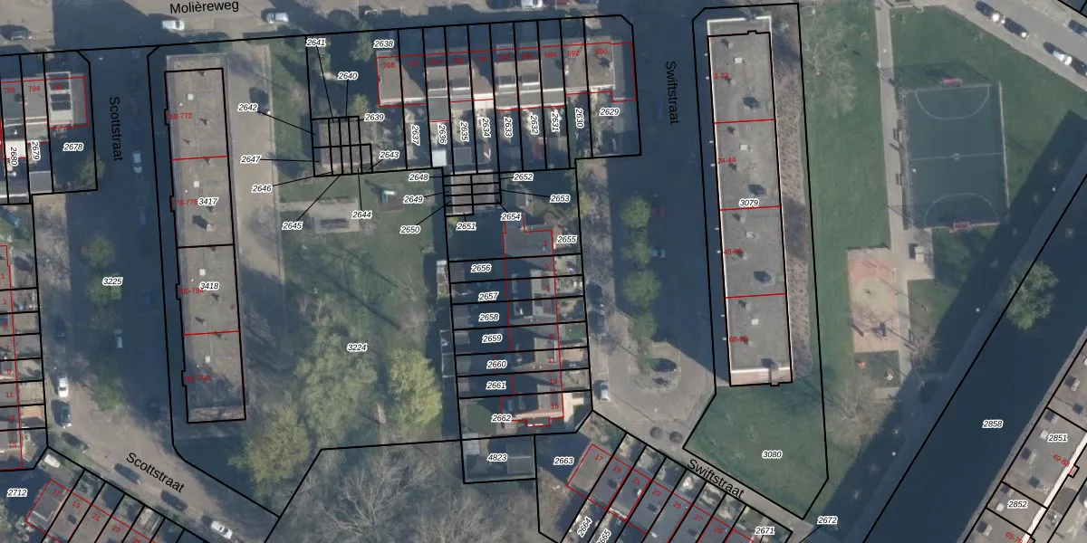 Gebruik de zoekbalk of klik op een perceel voor informatie over de adressen binnen dit perceel.