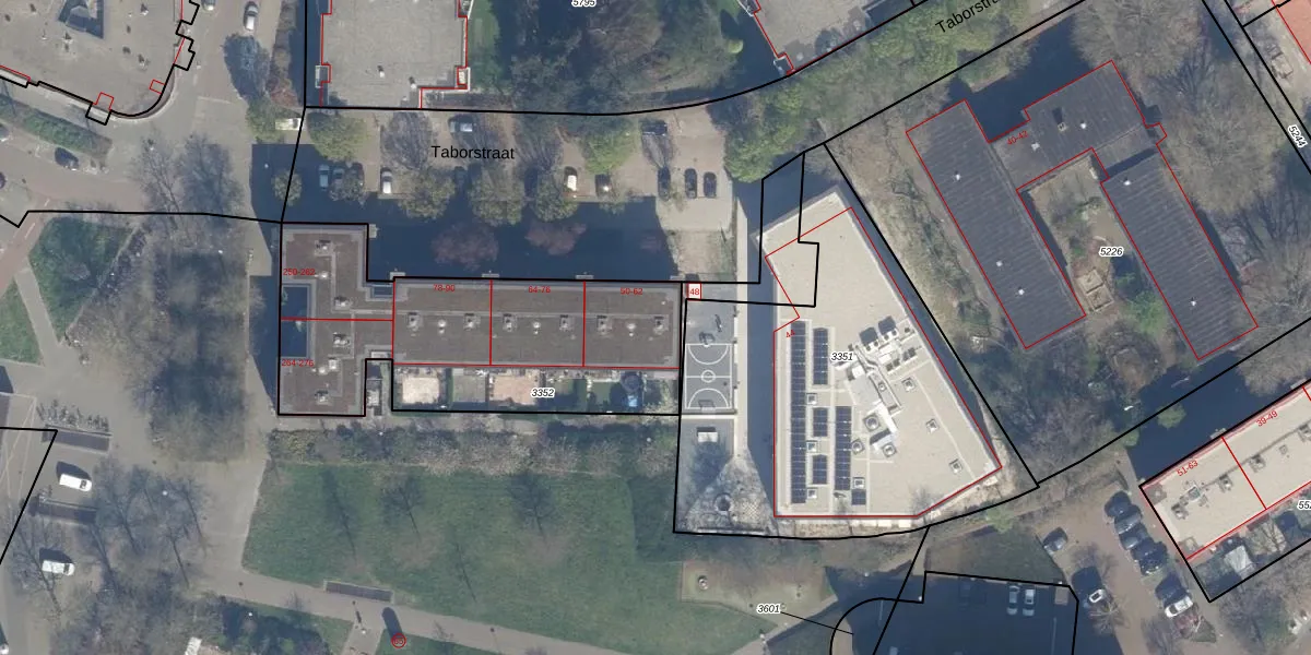 Het perceel waarop Taborstraat 62 staat heeft een oppervlakte van 1322 m². Dit is een zeer groot perceel. De perceeloppervlakte wordt geregistreerd door het Kadaster. Gedetailleerde informatie over de maten van dit perceel kunt u vinden in het rapport Kadastrale kaart met maatvoering van Taborstraat 62.