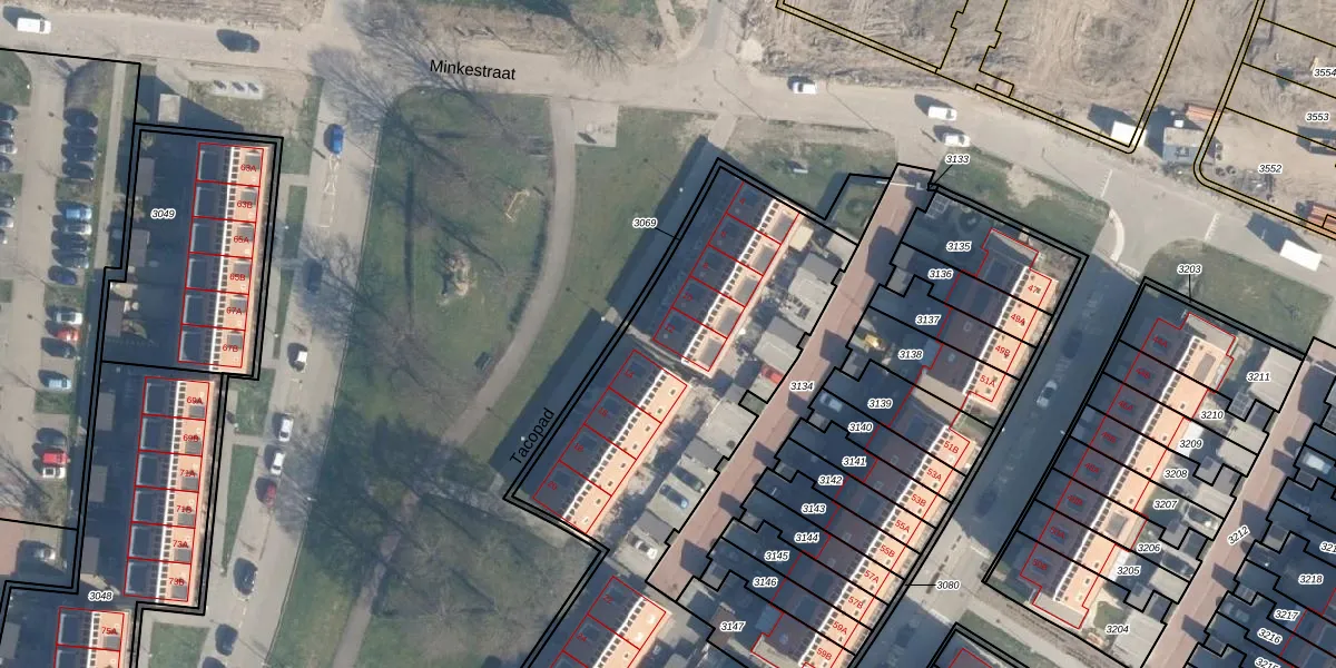 Het perceel waarop Tacopad 12 staat heeft een oppervlakte van 2995 m². Dit is een zeer groot perceel. De perceeloppervlakte wordt geregistreerd door het Kadaster. Gedetailleerde informatie over de maten van dit perceel kunt u vinden in het rapport Kadastrale kaart met maatvoering van Tacopad 12.