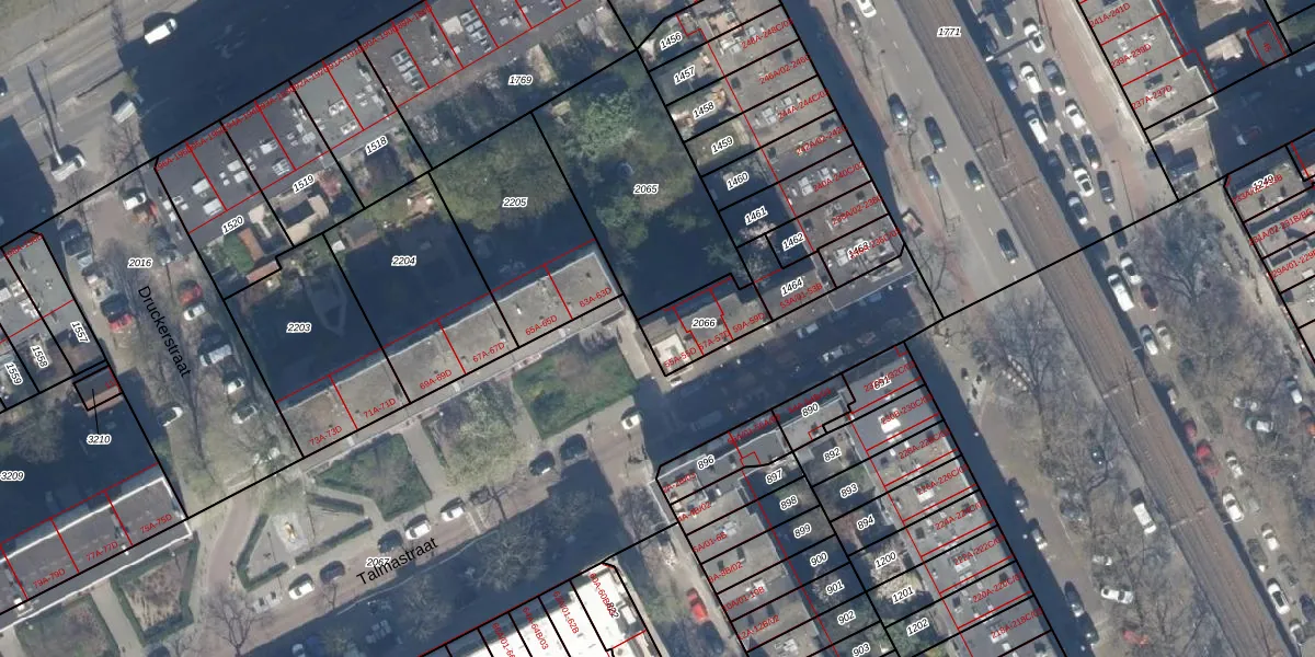 Talmastraat 57-A is gelegen op kadastraal perceel RTD10AB2066. Deze kadastrale aanduiding is uniek en wordt gebruikt door het Kadaster om eigendomsrechten en andere zakelijke rechten vast te leggen. Het perceel maakt onderdeel uit van de kadastrale gemeente Rotterdam.