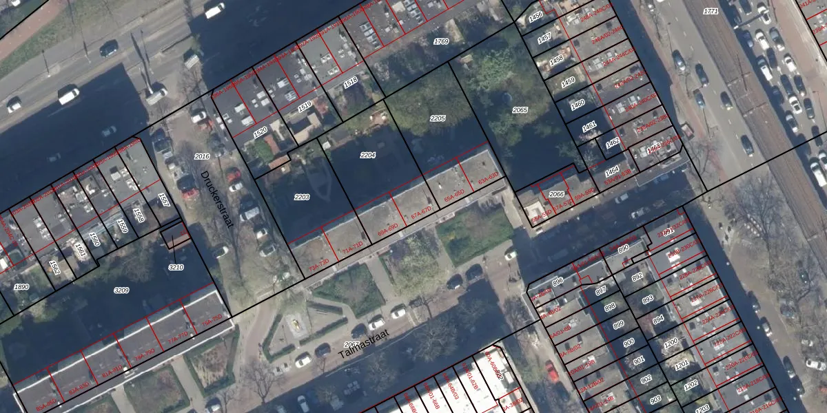 Talmastraat 67-A is gelegen op kadastraal perceel RTD10AB2204. Deze kadastrale aanduiding is uniek en wordt gebruikt door het Kadaster om eigendomsrechten en andere zakelijke rechten vast te leggen. Het perceel maakt onderdeel uit van de kadastrale gemeente Rotterdam.