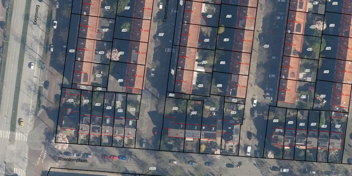 Tapuitstraat 104-A is gelegen op kadastraal perceel CLS00I416. Deze kadastrale aanduiding is uniek en wordt gebruikt door het Kadaster om eigendomsrechten en andere zakelijke rechten vast te leggen. Het perceel maakt onderdeel uit van de kadastrale gemeente Charlois.
