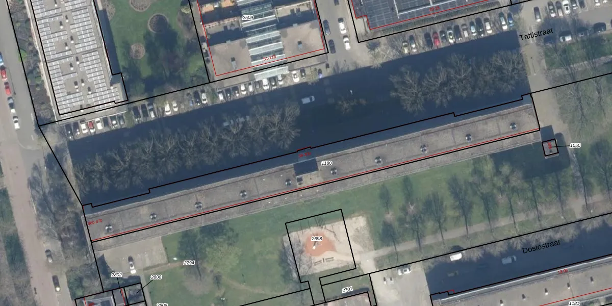 Het perceel waarop Tattistraat 164 staat heeft een oppervlakte van 1823 m². Dit is een zeer groot perceel. De perceeloppervlakte wordt geregistreerd door het Kadaster. Gedetailleerde informatie over de maten van dit perceel kunt u vinden in het rapport Kadastrale kaart met maatvoering van Tattistraat 164.