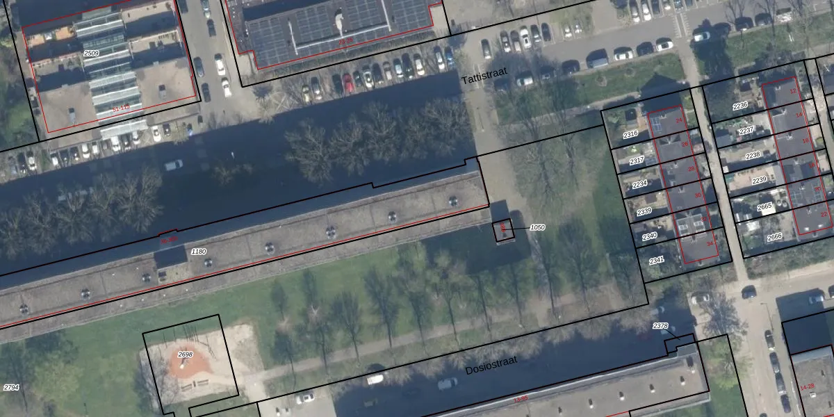 Het perceel waarop Tattistraat 46 staat heeft een oppervlakte van 1823 m². Dit is een zeer groot perceel. De perceeloppervlakte wordt geregistreerd door het Kadaster. Gedetailleerde informatie over de maten van dit perceel kunt u vinden in het rapport Kadastrale kaart met maatvoering van Tattistraat 46.