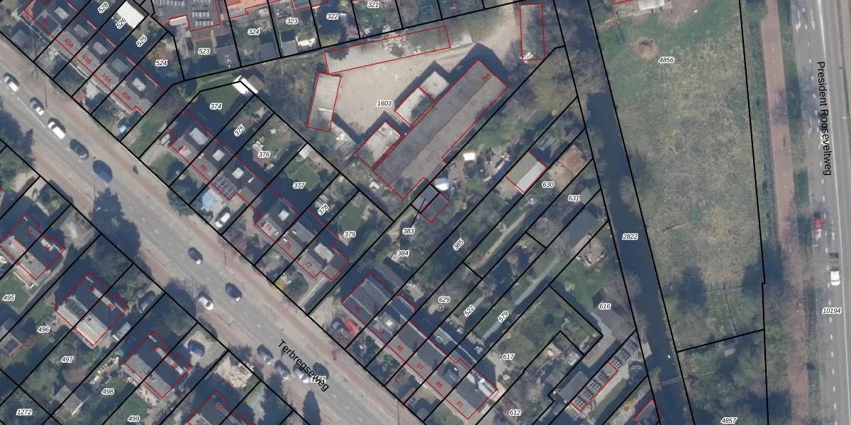 Het perceel waarop Terbregseweg 79 staat heeft een oppervlakte van 975 m². Dit is een groot perceel. De perceeloppervlakte wordt geregistreerd door het Kadaster. Gedetailleerde informatie over de maten van dit perceel kunt u vinden in het rapport Kadastrale kaart met maatvoering van Terbregseweg 79.