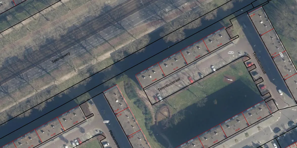 Het perceel waarop Terentiusstraat 73 staat heeft een oppervlakte van 1,3 ha. Dit is een zeer groot perceel. De perceeloppervlakte wordt geregistreerd door het Kadaster. Gedetailleerde informatie over de maten van dit perceel kunt u vinden in het rapport Kadastrale kaart met maatvoering van Terentiusstraat 73.