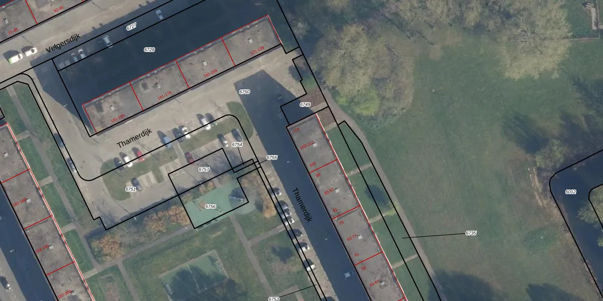 Thamerdijk 105 is gelegen op kadastraal perceel ISM01B6747. Deze kadastrale aanduiding is uniek en wordt gebruikt door het Kadaster om eigendomsrechten en andere zakelijke rechten vast te leggen. Het perceel maakt onderdeel uit van de kadastrale gemeente IJsselmonde.