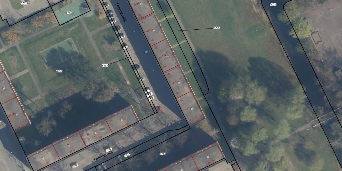 Thamerdijk 25 is gelegen op kadastraal perceel ISM01B6747. Deze kadastrale aanduiding is uniek en wordt gebruikt door het Kadaster om eigendomsrechten en andere zakelijke rechten vast te leggen. Het perceel maakt onderdeel uit van de kadastrale gemeente IJsselmonde.