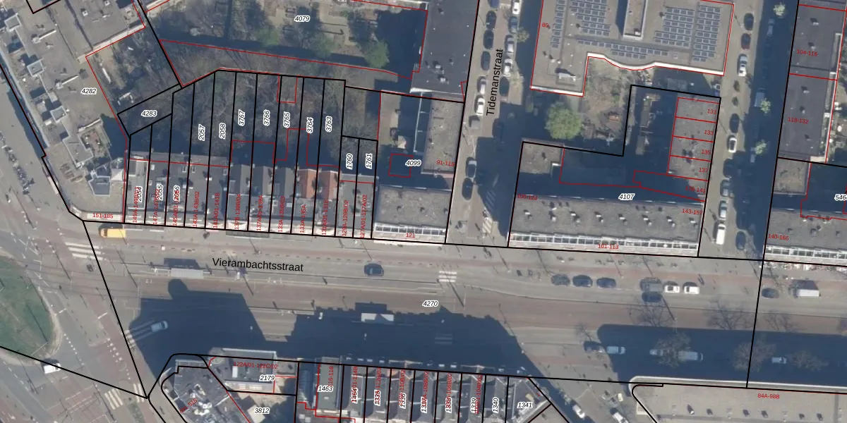 Tidemanstraat 107 is gelegen op kadastraal perceel DHV00I4099. Deze kadastrale aanduiding is uniek en wordt gebruikt door het Kadaster om eigendomsrechten en andere zakelijke rechten vast te leggen. Het perceel maakt onderdeel uit van de kadastrale gemeente Delfshaven.