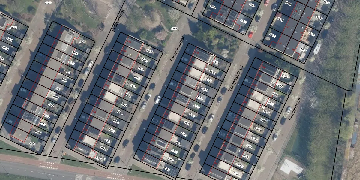 Tornadostraat 9-B is gelegen op kadastraal perceel ISM01D4574. Deze kadastrale aanduiding is uniek en wordt gebruikt door het Kadaster om eigendomsrechten en andere zakelijke rechten vast te leggen. Het perceel maakt onderdeel uit van de kadastrale gemeente IJsselmonde.
