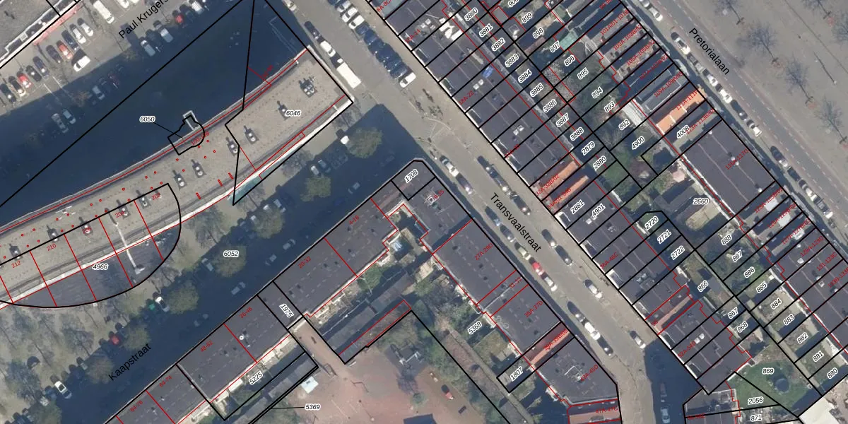 Het perceel waarop Transvaalstraat 25 staat heeft een oppervlakte van 2415 m². Dit is een zeer groot perceel. De perceeloppervlakte wordt geregistreerd door het Kadaster. Gedetailleerde informatie over de maten van dit perceel kunt u vinden in het rapport Kadastrale kaart met maatvoering van Transvaalstraat 25.