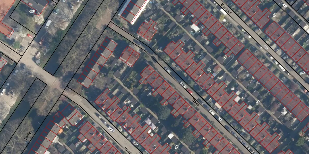Het perceel waarop Treek 48 staat heeft een oppervlakte van 7918 m². Dit is een zeer groot perceel. De perceeloppervlakte wordt geregistreerd door het Kadaster. Gedetailleerde informatie over de maten van dit perceel kunt u vinden in het rapport Kadastrale kaart met maatvoering van Treek 48.