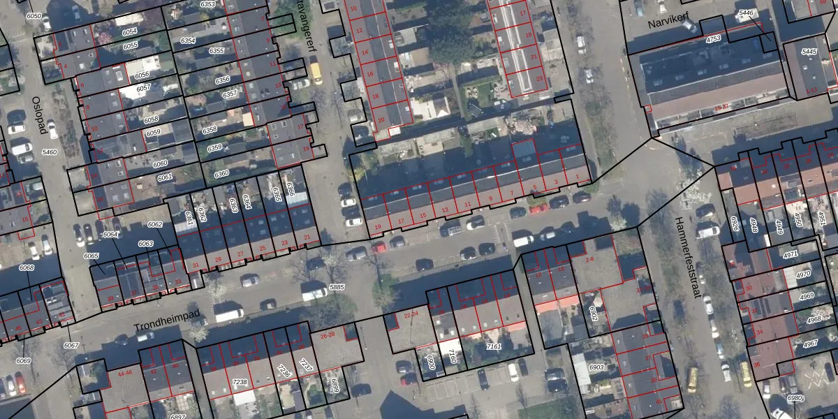 Het perceel waarop Trondheimpad 15 staat heeft een oppervlakte van 4415 m². Dit is een zeer groot perceel. De perceeloppervlakte wordt geregistreerd door het Kadaster. Gedetailleerde informatie over de maten van dit perceel kunt u vinden in het rapport Kadastrale kaart met maatvoering van Trondheimpad 15.
