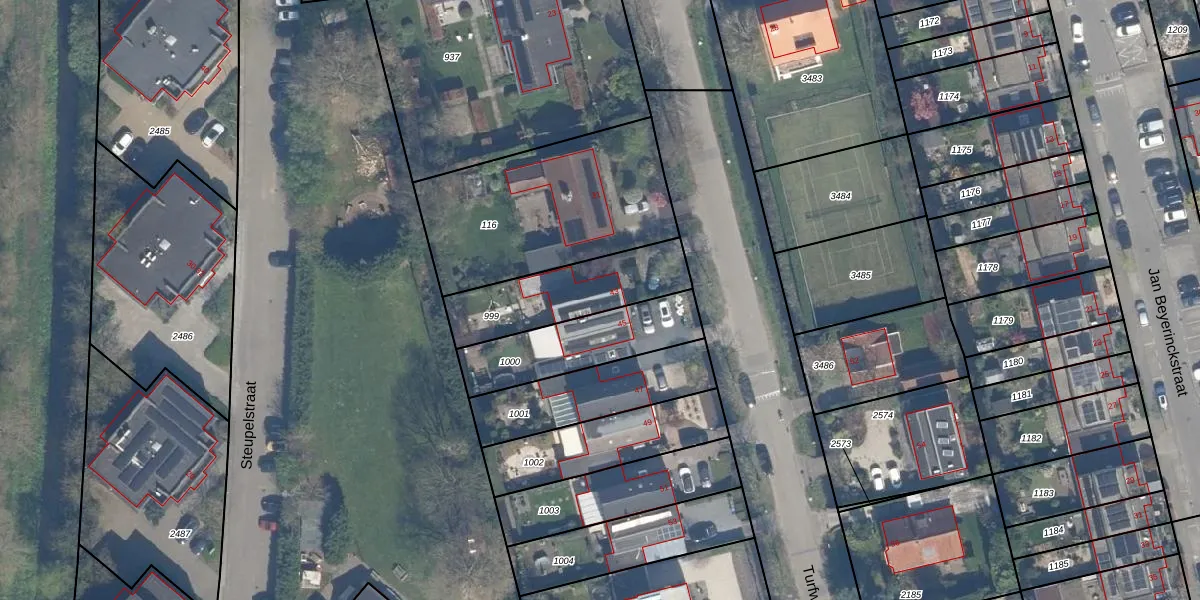 Het perceel waarop Turfweg 43 staat heeft een oppervlakte van 363 m². Dit is een groot perceel. De perceeloppervlakte wordt geregistreerd door het Kadaster. Gedetailleerde informatie over de maten van dit perceel kunt u vinden in het rapport Kadastrale kaart met maatvoering van Turfweg 43.