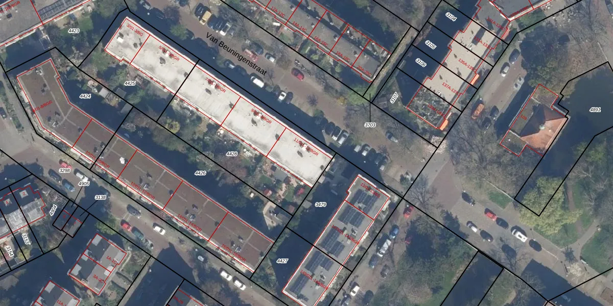 Het perceel waarop Van Beuningenstraat 11-01L staat heeft een oppervlakte van 1355 m². Dit is een zeer groot perceel. De perceeloppervlakte wordt geregistreerd door het Kadaster. Gedetailleerde informatie over de maten van dit perceel kunt u vinden in het rapport Kadastrale kaart met maatvoering van Van Beuningenstraat 11-01L.