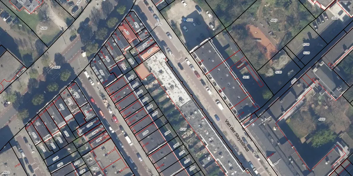 Het perceel waarop Van der Sluysstraat 19-B staat heeft een oppervlakte van 1800 m². Dit is een zeer groot perceel. De perceeloppervlakte wordt geregistreerd door het Kadaster. Gedetailleerde informatie over de maten van dit perceel kunt u vinden in het rapport Kadastrale kaart met maatvoering van Van der Sluysstraat 19-B.