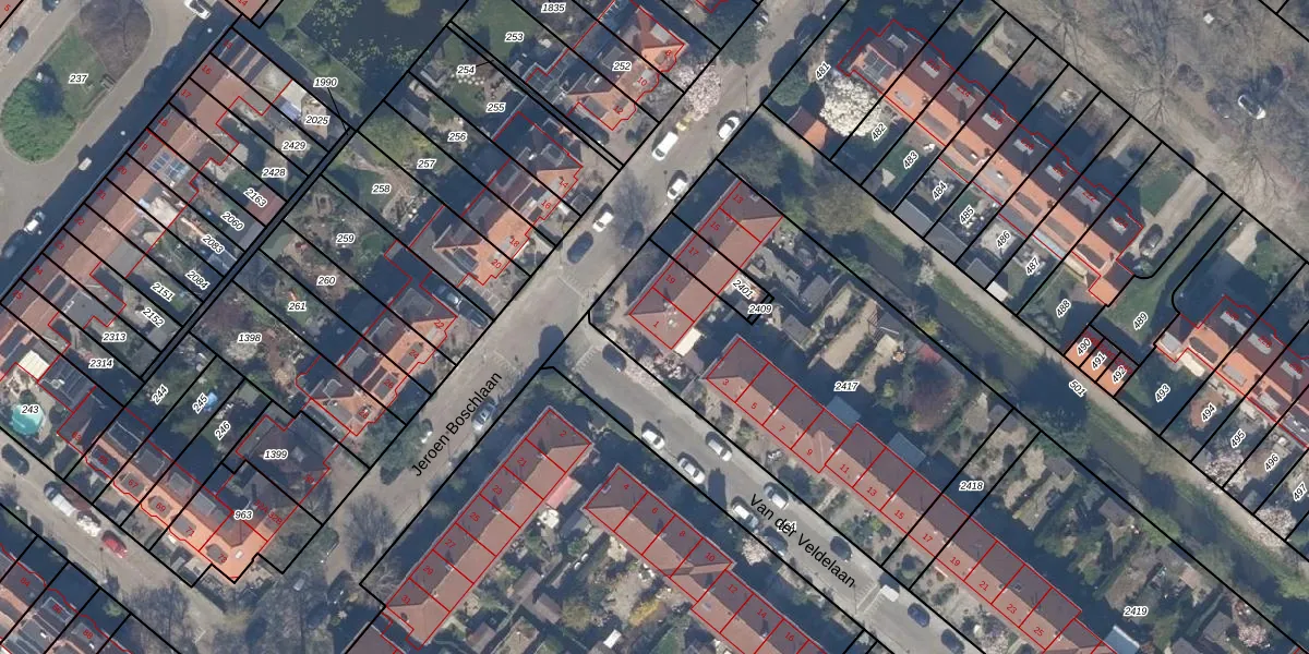 Het perceel waarop Van der Veldelaan 1 staat heeft een oppervlakte van 1775 m². Dit is een zeer groot perceel. De perceeloppervlakte wordt geregistreerd door het Kadaster. Gedetailleerde informatie over de maten van dit perceel kunt u vinden in het rapport Kadastrale kaart met maatvoering van Van der Veldelaan 1.