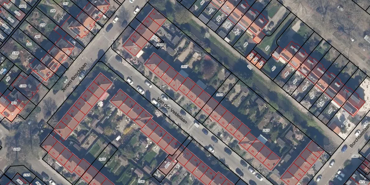 Het perceel waarop Van der Veldelaan 11 staat heeft een oppervlakte van 1775 m². Dit is een zeer groot perceel. De perceeloppervlakte wordt geregistreerd door het Kadaster. Gedetailleerde informatie over de maten van dit perceel kunt u vinden in het rapport Kadastrale kaart met maatvoering van Van der Veldelaan 11.